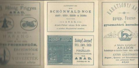Aradi Marospart - Indóház, Városliget -Lövölde Neumann gyár - Massage intézet -Salaczpark - Kereskedelmi akadémia Arad-csanádi vasútak palotája - Városháza -Neumann palota Hermann palota - Színház -Simay gyógy-fürdő Iparosház - Domány udvar -Honvéd emlék - Vértanik kivég. helye Aradi vár kapuja stb. reklámok: Domány József borcsarnoka, Ménesi cognac Pollak és Polgár mezőgazdasági gépek Beck Alajos édességek Probst Károly és Társai, Arad,Atzél Péter utza 3. Simay István a Maros-gőzfüdő tulajdonosa Buchsbaum cípők-raktára Fleischer Adolf lakatos mester Kneffel Károly és fia vaskereskedése Hőnig Frigyes Harang és Tűzi-fecslendők, ércöntőde szivattyúk... stb.