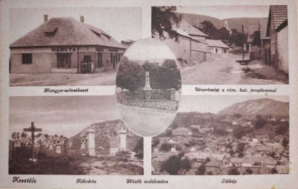 képeslap - Kesztölc- Hangya szövetkezet, utca, Kálvária, Hősök emlékm, Látkép