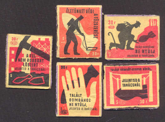 5 db magyar gyufacímke (Talált bombához ne nyúlj, jelentsd a Tanácsnál stb)