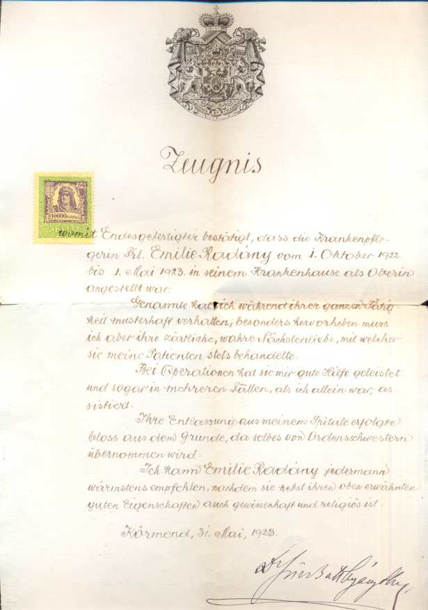 hozzá tartozik: a tabáni róm. kath. plébánia keresztleveleének 1931-es másolata Radvány Emilia részére