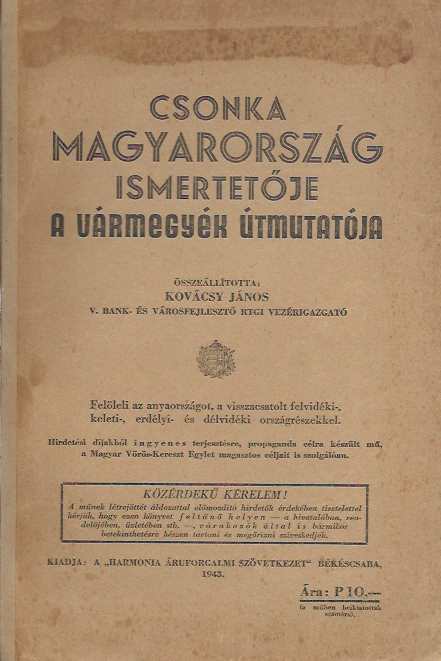 Kovácsy János: Csonka Magyarország ismertetője. A vármegyék útmutatója. Felöleli az anyaországot, a visszacsatolt felvidéki-, keleti-, erdélyi- és délvidéki országrészekkel.