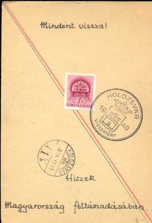 Kolozsvár visszatért emlékbélyegzéssel. Postázott lap 1940. IX.17.