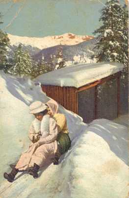 Szánkózás. Osztrák üdvözlőlap 1908-ból.