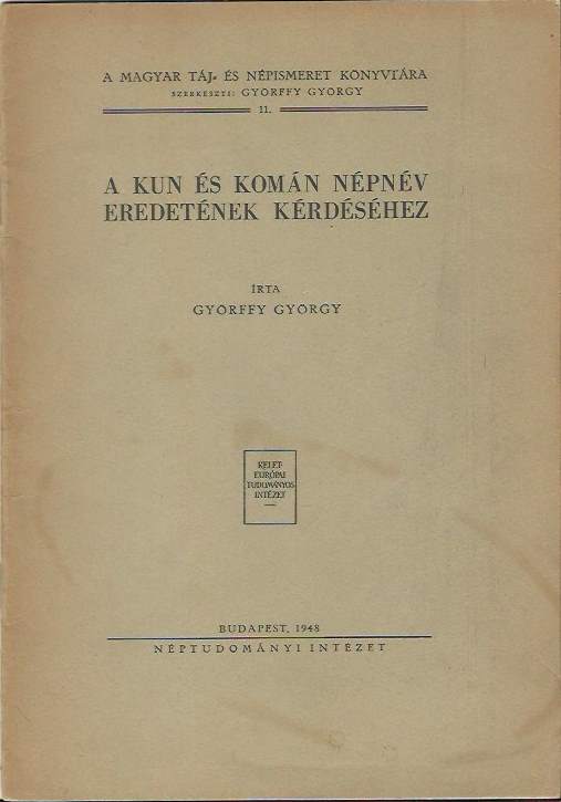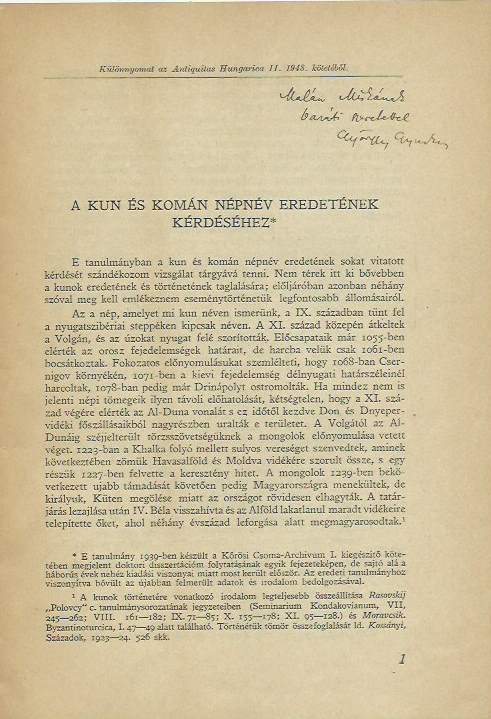 Györffy György: A kun és komán népnév eredetének kérdéséhez. Dedikált