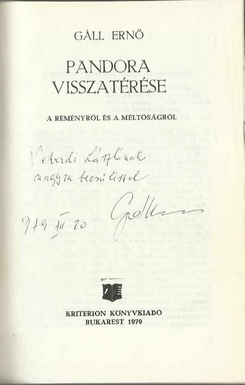 Gáll Ernő: Pandóra visszatérése. Dedikált.