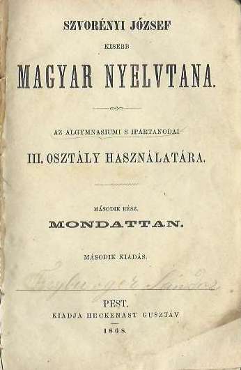 Szvorényi József: Kisebb magyar nyelvtana. Az algymnasiumi s az ipartanodai III. osztály használatára. Második rész. Mondattan