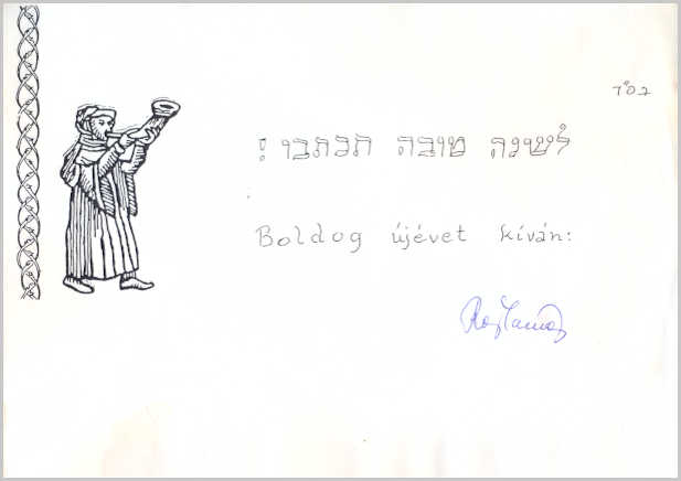 kézirat - Raj Tamás (1940-2010) magyar történész, főrabbi aláírása egy Boldog újévet papíron