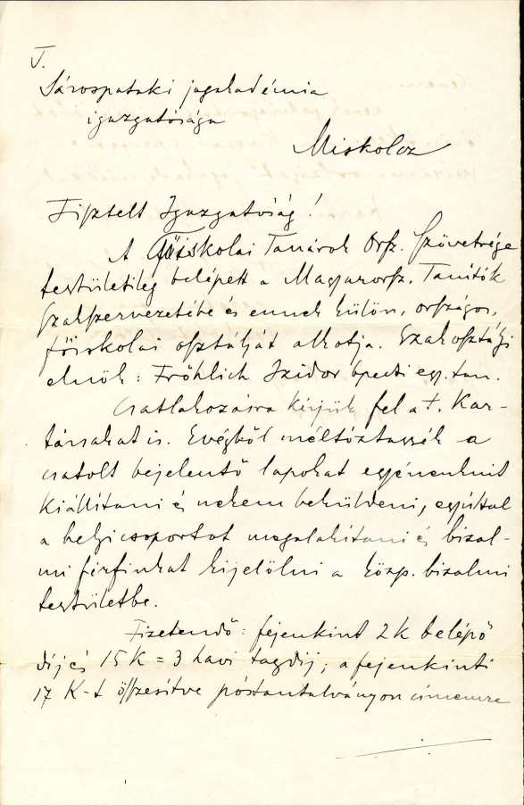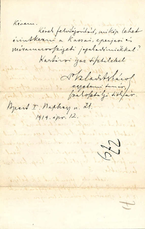 Dr. Szladits Károly (1871-1956) jogász, egyetemi tanár, az MTA tagja autográf levele a sárospataki jogakadémia igazgatóságához.