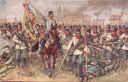 Benedek Lajos tábornok a solferinoi csatában, rajzos katonai képeslapon