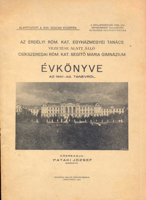 Az erdélyi róm. kat. egyházmegyei tanács vezetése alatt álló csíkszeredai Róm. Kat. Segítő Mária Gimnázium évkönyve az 1941 - 42. tanévre.