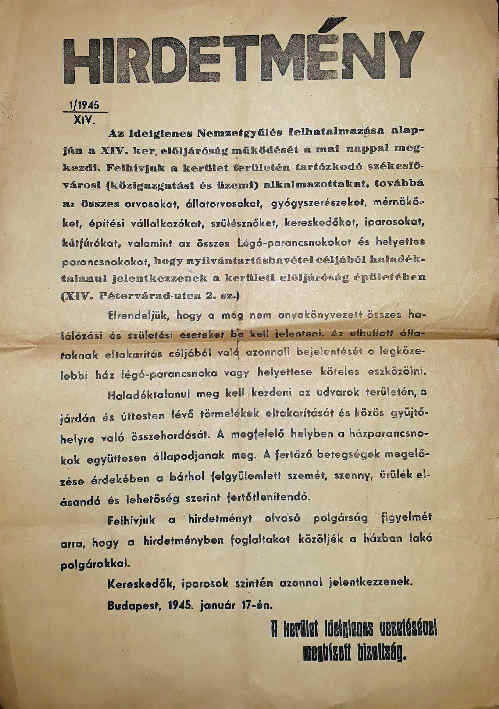 HIRDETMÉNY 1945 január 17. - Budapest XIV. kerületi ideiglenes vezetéssel megbízott bizottságának működésének megkezdéséről.