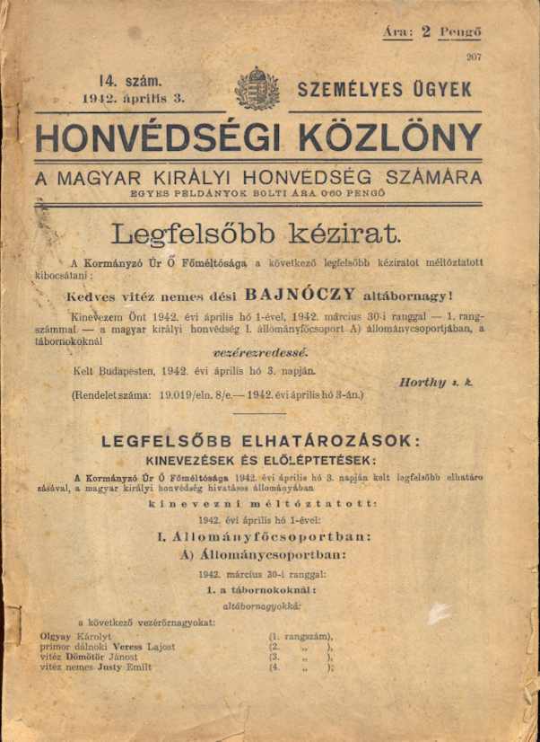 Honvédségi Közlöny a Magyar Királyi Honvédség számára - Személyes Ügyek (14. szám) 1942