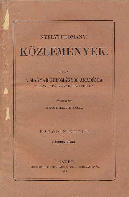 Elérhető még: Hunfalvy Pál (szerk): Nyelvtudományi Közlemények (hatodik kötet) 3. füzet. Szerzők: Fogarasi János, Hunfalvy Pál, Gr. Kuun Géza, Budenz József 321-480p-ig. Felvágatlan. Sérült kiadói borítóban. Ár: 800 Ft