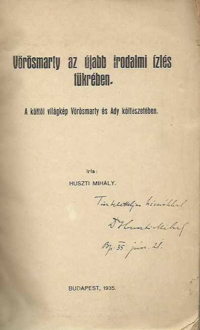 Huszti Mihály: Vörösmarty az újabb irodalmi ízlés tükrében. Költői világkép Vörösmarty és Ady költészetében. Dedikált.