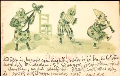 képeslap: Üdvözlet. Három zenélő bohóc