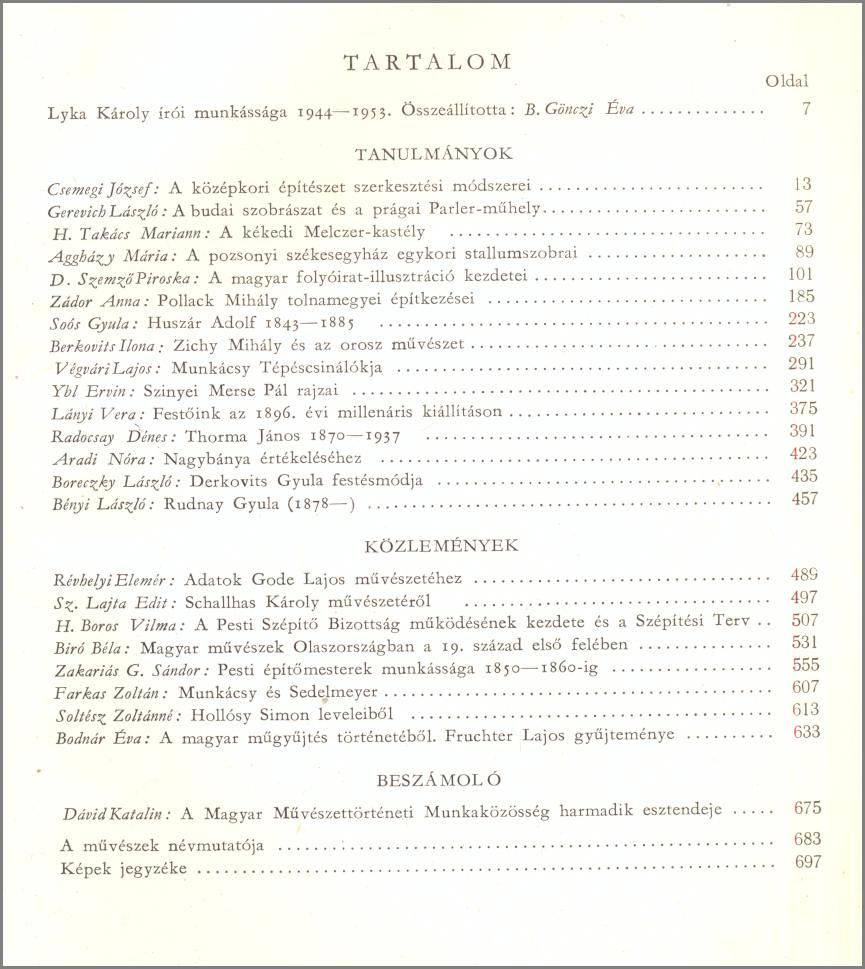 Gerevich: A budai szobrászat és a prágai Parler-műhely, / Zichy Mihály és az orosz művészet / Derkovits Gyula festésmódja / Rudnay Gyula / A pesti építőmesterek munkássága / A Pesti Szépítő Bizottság működése stb.