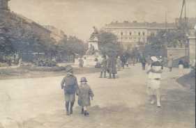 régi amatőrfénykép a 20. század elejéről: sétáló emberek a Nemzeti Múzeum kertjében