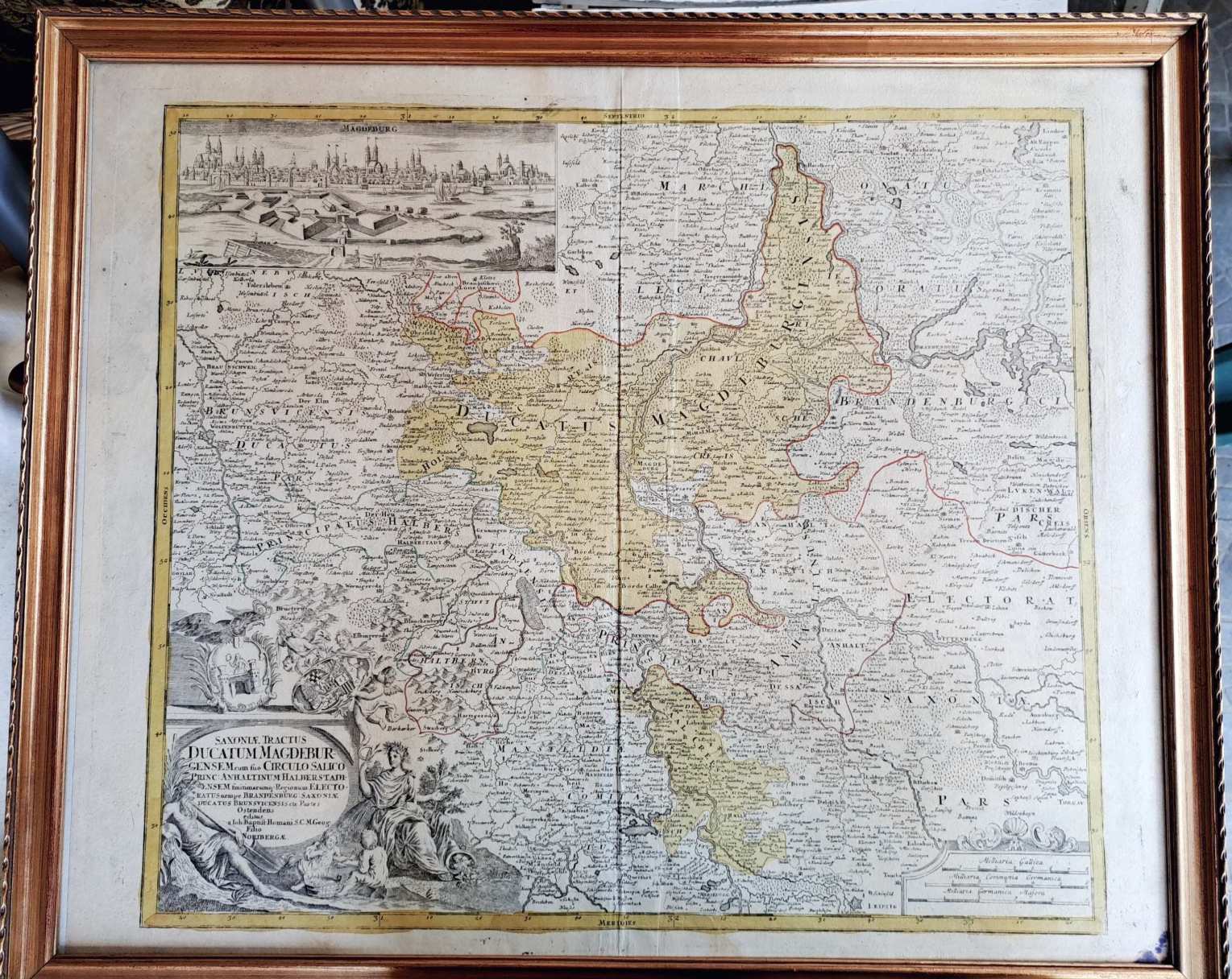 Térképméret: 54×47 cm. Lapméret: 62 x 52 cm. Képkeretben. Színezett rézmetszet. A térkép északi részén Magdeburg város látképe.