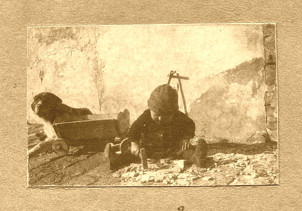 fotó: kisfiú játszik, mellette kutya 1900 körüli (6x4 cm, kartonra ragasztva)
