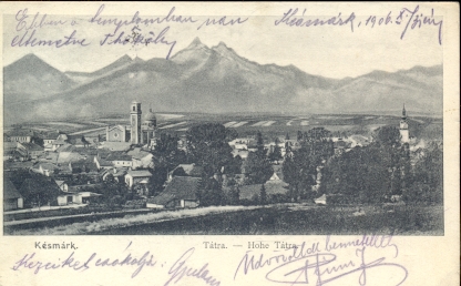 Késmárk / Tátra ---korabeli képeslapon. "Késmárk p.u." bélyegzéssel 1906