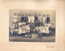 Régi, kartonra ragasztott iskolai csoportkép, lány tagozat 1937-ből. Fotós: Kozma, Ujpest, Árpád út 38
